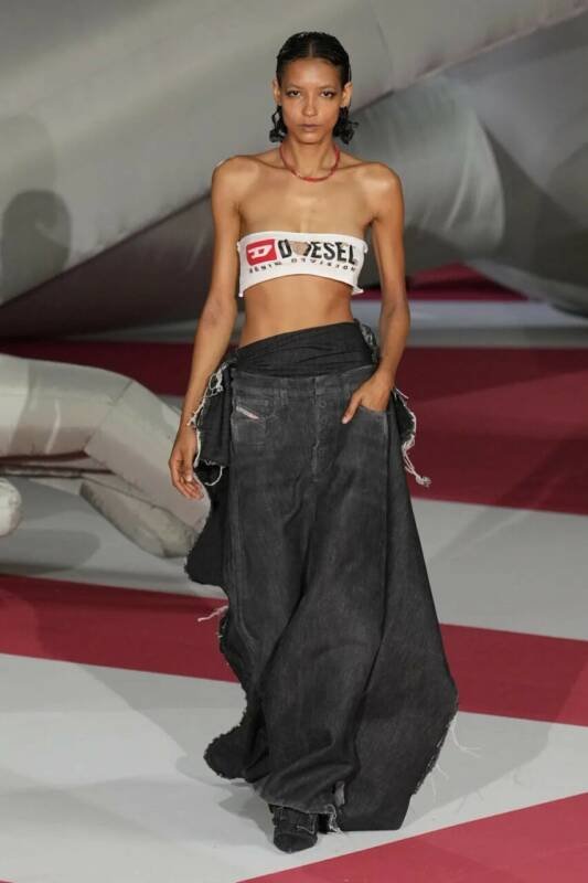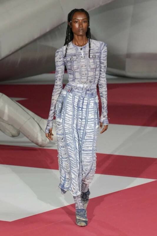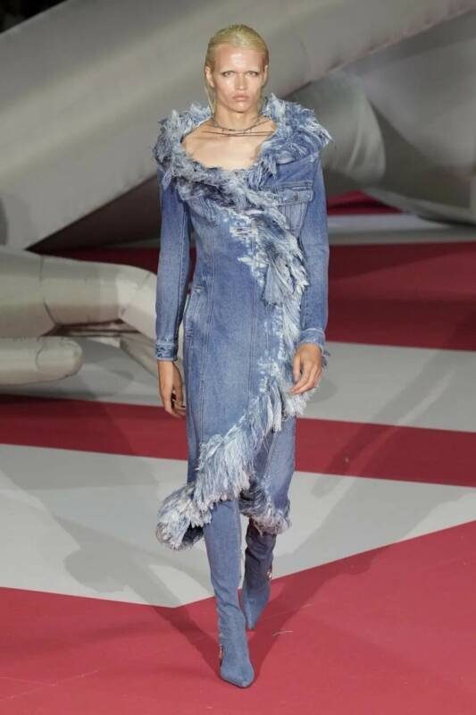 Na passarela a coleção apresentou várias formas de se vestir o Denim, bem como as diversas possibilidades de brincar com o tecido através de tratamentos de lavanderia, impressões especiais, marcações a laser criam estampas trompe-l’oeil de segunda pele, efeitos texturizados e o Denim devoré em base transparente em algumas peças como cintura do espartilho de calça jeans cintura baixa.