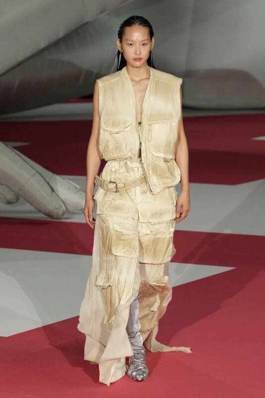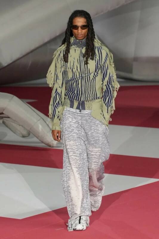 Glenn, gosta de apostar em construções inesperadas, um exemplo, o casaco feito a partir de 15.000 etiquetas envelhecidas e escovadas da Diesel, par de calças jeans estica-se para cima como um espartilho. Também vimos vestidos levemente drapeados com correntes.