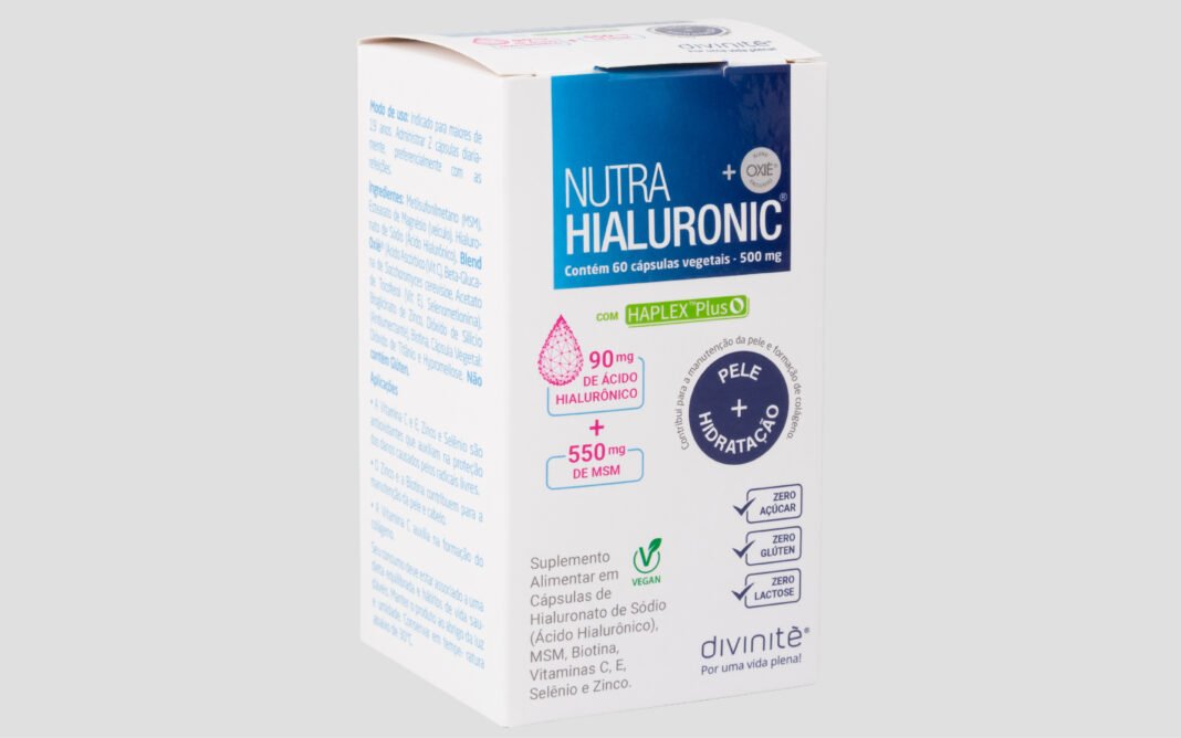 Para oferecer todos esses benefícios, a Divinitè Nutricosméticos apresenta o Nutrahialuronic, que leva o consumo da molécula além, propondo sua ingestão por meio de nutricosméticos. Isso é possível, pois sua formulação contém o Ácido Hialurônico HAPLEX® Plus, fragmentado em moléculas de baixo peso molecular o que garante sua biodisponibilidade e permite resultados do ativo direcionados à pele.