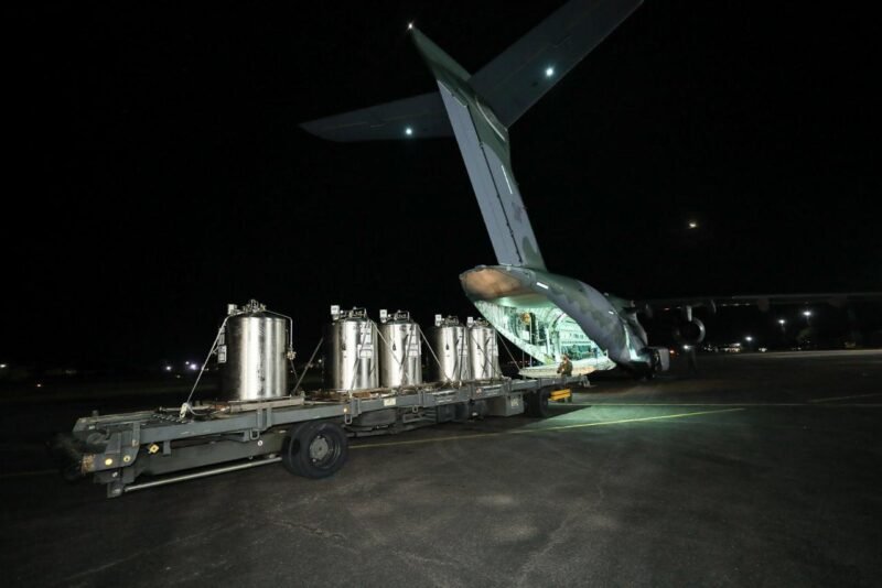O Governo do Amazonas recebeu, na tarde deste sábado (16/01), cinco tanques de oxigênio líquido e mais 305 cilindros de oxigênio, que foram transportados diretamente do Aeroporto Internacional de Guarulhos, em São Paulo. Além do oxigênio, a aeronave do Exército Brasileiro descarregou 10 toneladas de material hospitalar, que serão utilizados no Hospital Nilton Lins, referência para o tratamento da Covid-19.