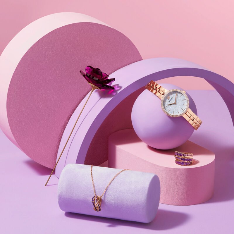 Nada melhor do que uma joia para eternizar um momento e demonstrar o sentimento. A Swarovski fez uma seleção dos melhores itens para celebrar o amor. Entre as peças estão o relógio Crystalline Deligh, o Anel Twist, roxo, banhado a ródio e o Pingente Twist, roxo, banhado a ródio.