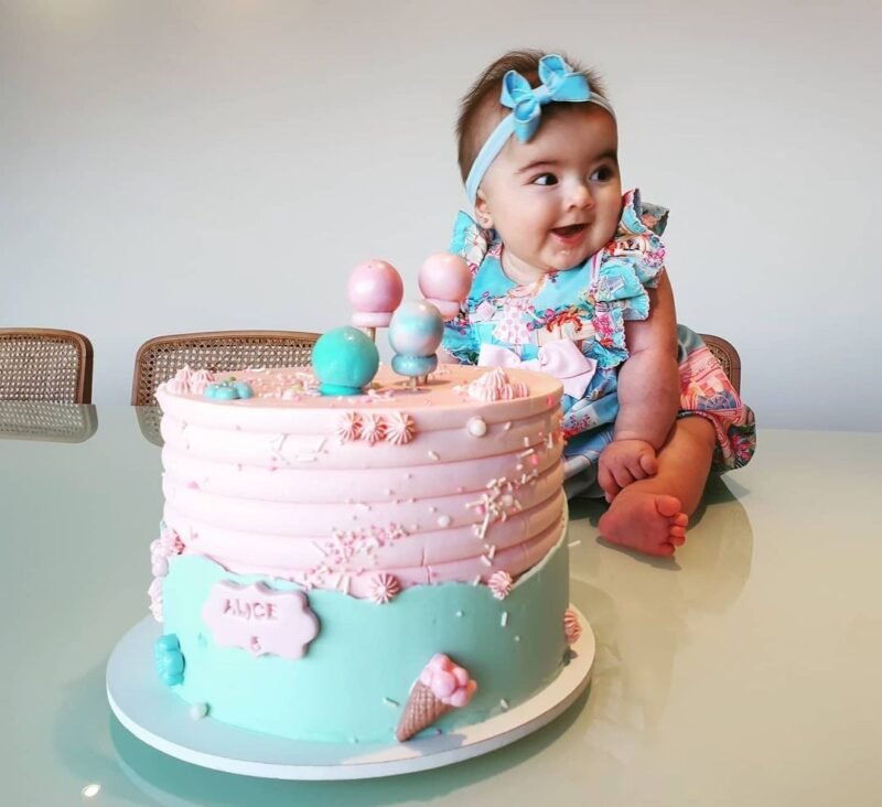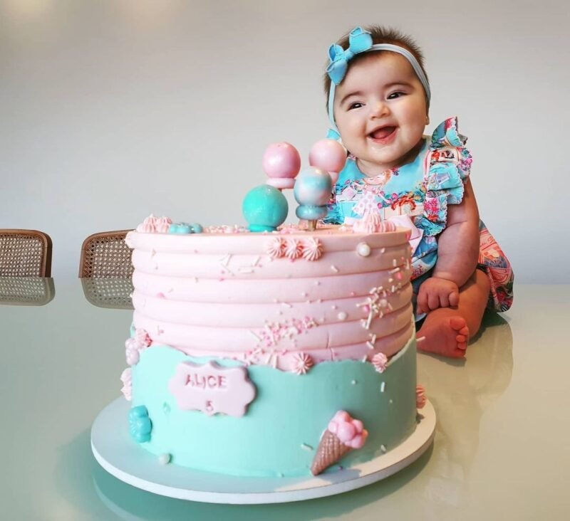Marcelo Adnet e a mulher, Patrícia Cardoso, comemoram os 5 meses da única filha, Alice, com uma festinha em casa nesta quinta-feira (6). A atriz compartilhou no Instagram uma série de fotos da pequena, sentanda na mesa da sala na frente do bolo, rosa com detalhes em azul e decoração de sorvete.