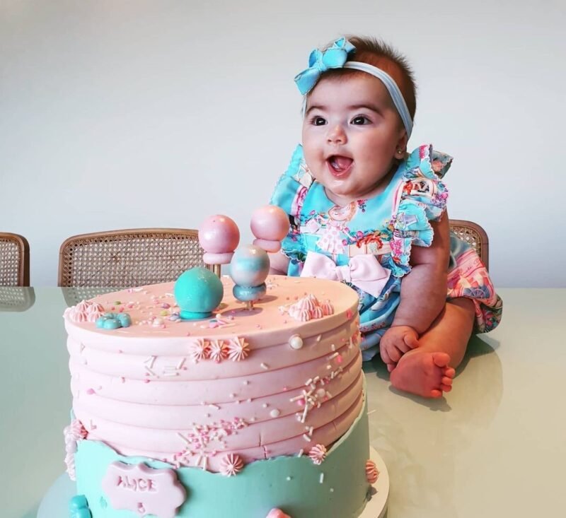 Alice, que usava uma faixa na cabeça e vestido estampado em tons de azul e rosa estava toda sorridente nas imagens. “5 meses do maior amor do mundo!”, escreveu Patrícia. As fotos da menina receberam elogios dos amigos do casal e de seguidores.