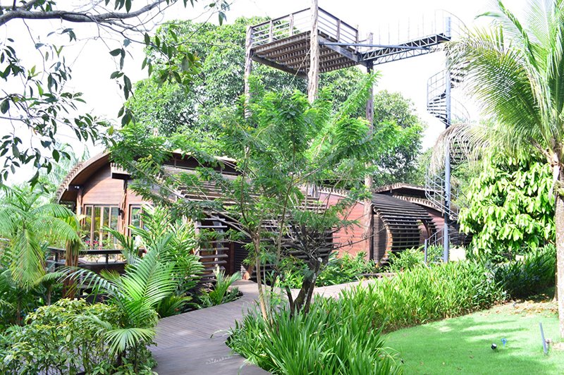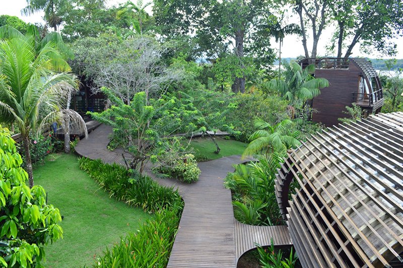 Com tanta riqueza em volta, não poderia ser diferente: o partido arquitetônico nasceu da necessidade de criar uma pousada totalmente integrada ao entorno, com o objetivo de estabelecer uma interligação entre as navegações no Rio Negro – pelos barcos que fazem as expedições – e as chegadas e saídas em terra. A estruturação do projeto do Hotel Mirante do Gavião parte de um planejamento sustentável que prevê o aproveitamento do clima, dos materiais e das tecnologias construtivas locais
