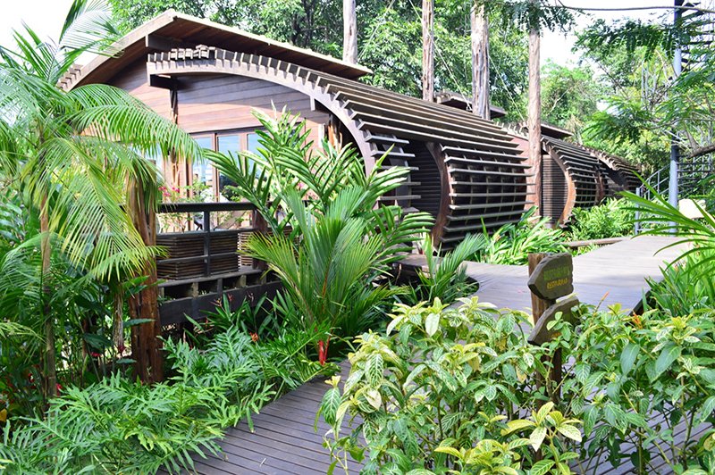 A proposta do partido envolve palafitas conectadas por decks, onde prevalece uma ventilação inferior que reduz a temperatura interna. “O Mirante do Gavião Amazon Lodge possui uma arquitetura que repousa sobre o terreno, mas claramente não tem impacto sobre ele, integrando arquitetura, paisagem e sociedade”, defende Armando Prieto.