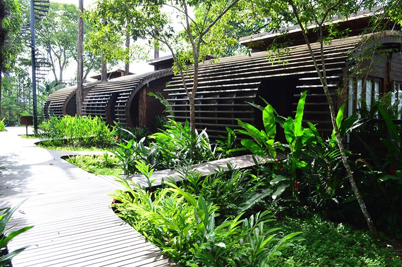 O programa inclui unidades habitacionais, áreas operacionais, áreas de serviços e de recreação, entre outros usos, projetados para interagir com a paisagem natural. Os chalés, elevados sobre pilotis, permitem à natureza seguir sem barreiras, de forma natural sem impermeabilizar o solo. Patricia O’Reilly explica que isso acontece porque as palafitas altas permitem a circulação da ventilação inferior, que reduz a umidade e baixa a temperatura interna. “Estas construções são relacionadas entre si por sistemas de circulação elevados e decks”.