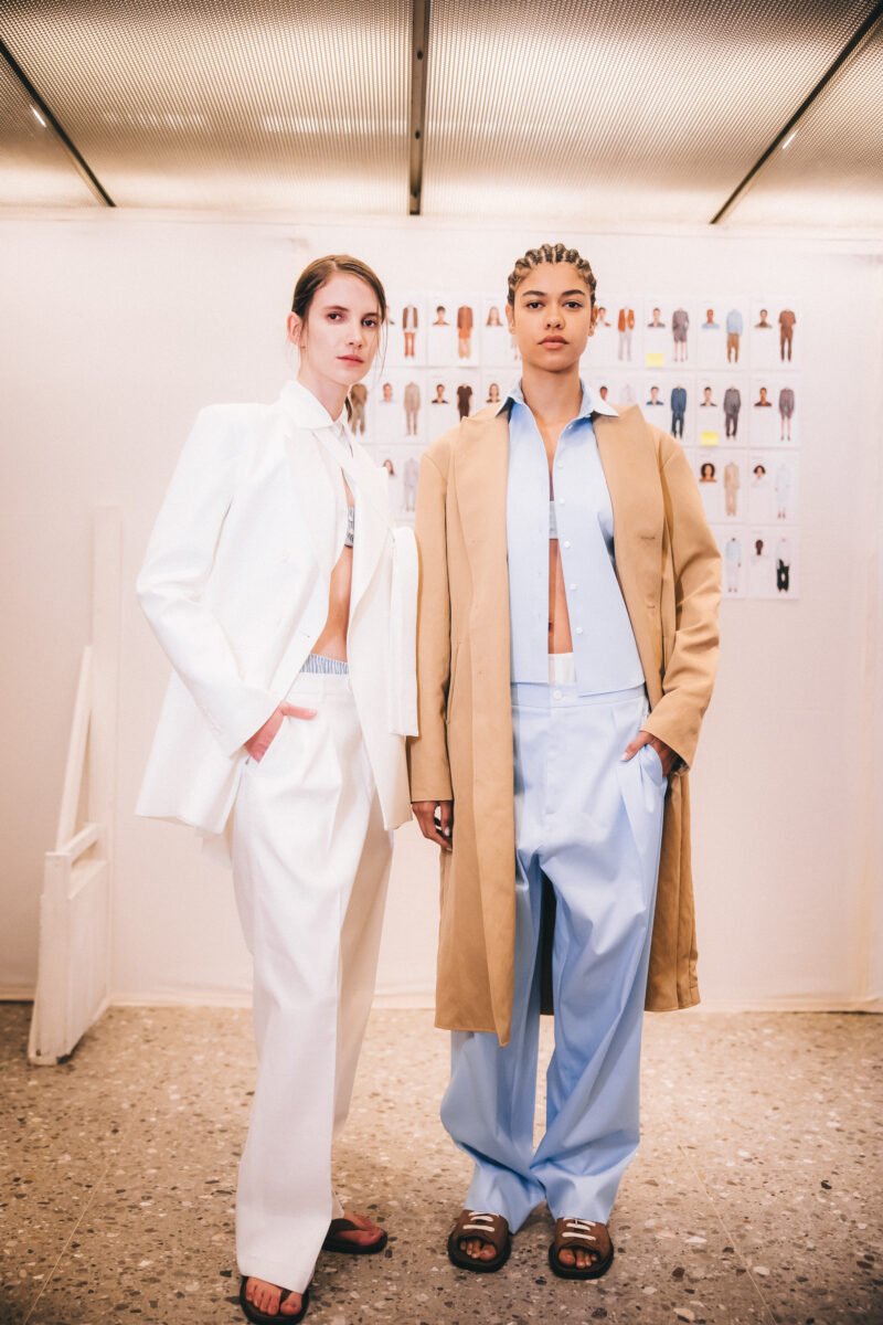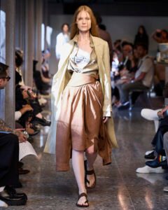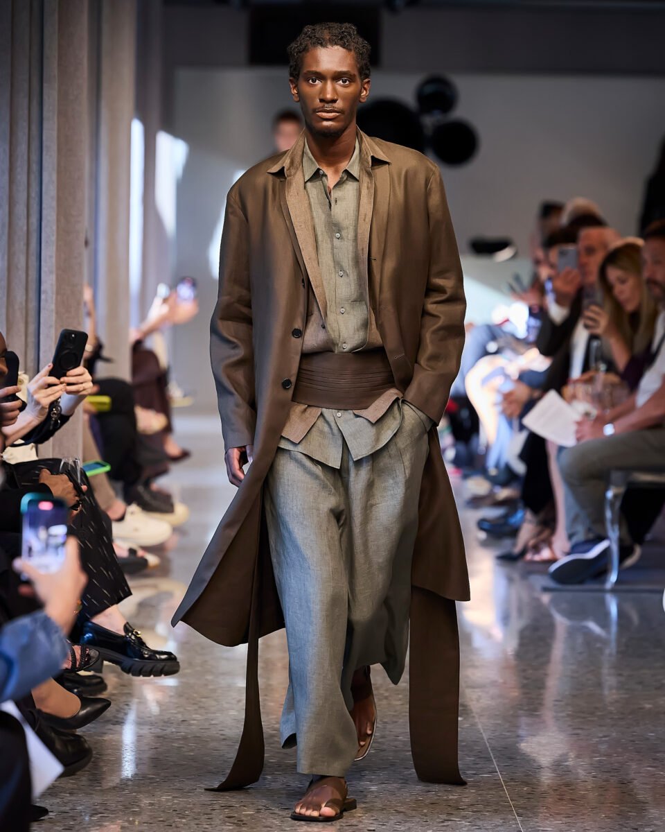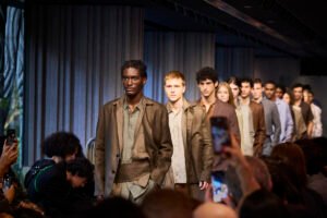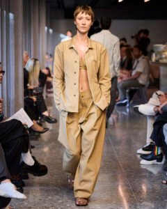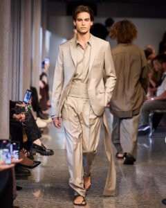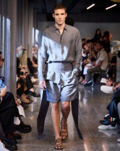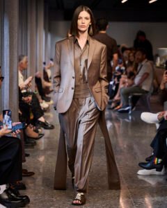 A cartela de cores percorreu tons terrosos sofisticados — do chocolate ao off-white — com toques de azul céu e cinzas frios, trazendo leveza. Entre as novidades, a estreia de sandálias e chinelos, desenhados com recortes e tiras que traduzem frescor urbano.